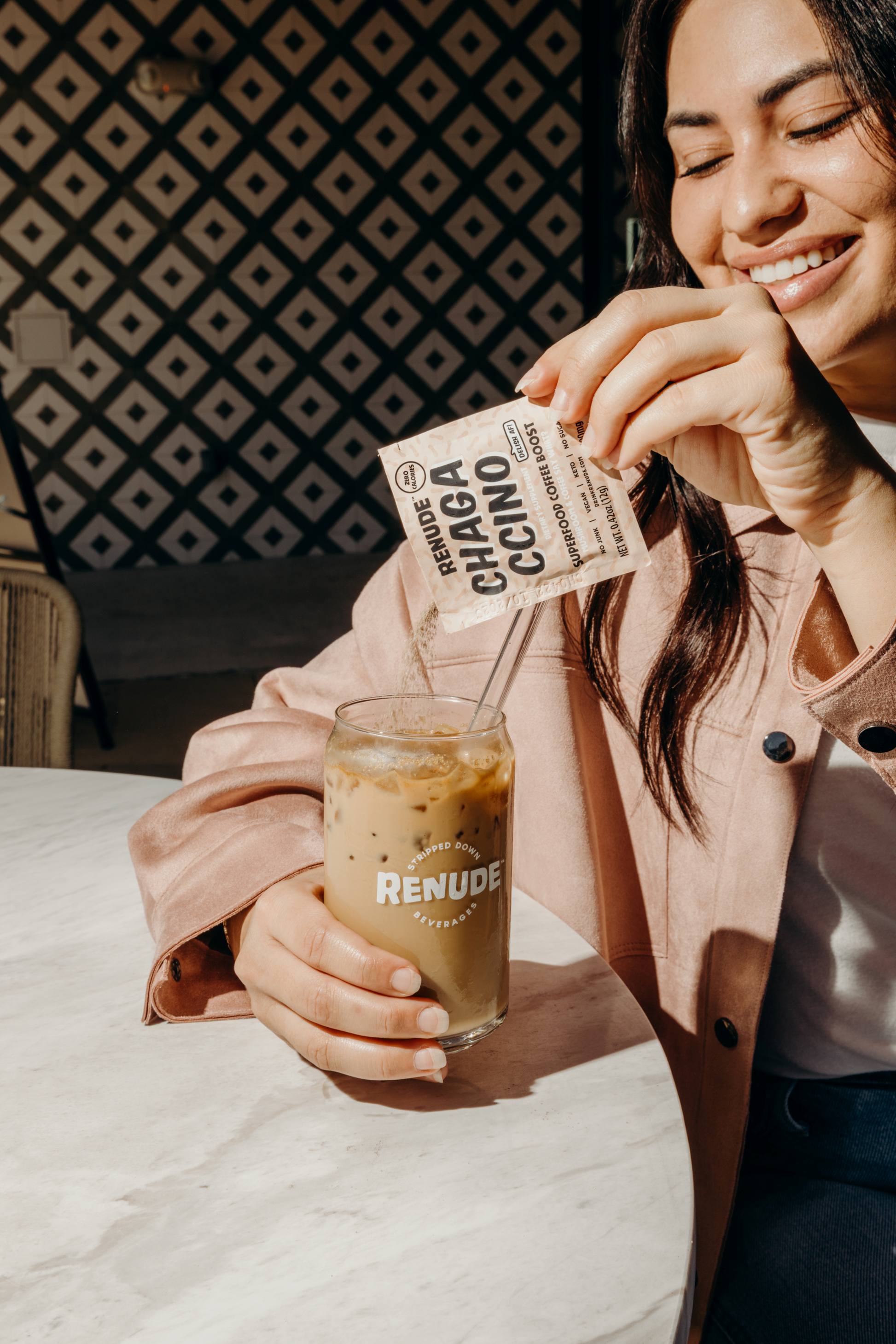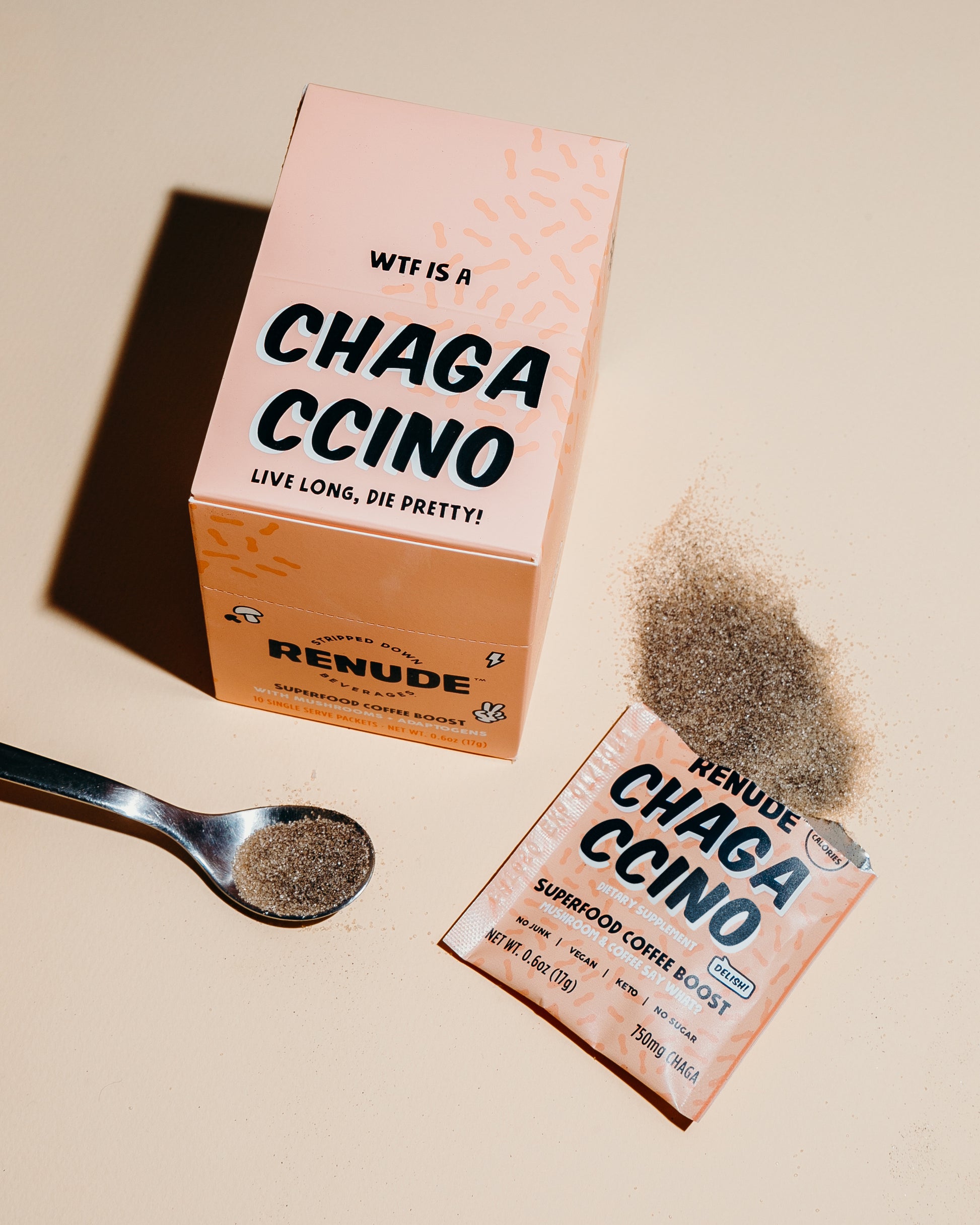 "Chagaccino is a clean, organic, plant-based, zero sugar, keto, and low calorie treat, spiked with an effective dose of the planet's greatest adaptogen." - Renude
